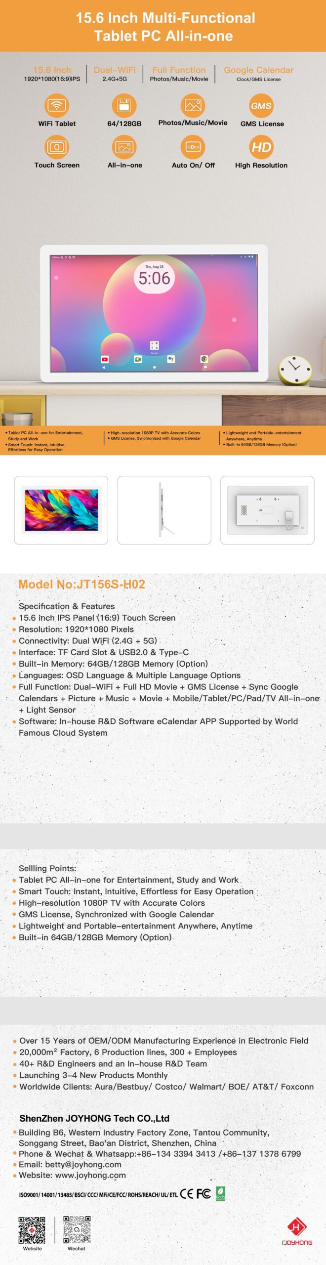 15.6’’ Tablet PC All-in-one 1920*1080 (16:9) + GMS License + Synchronized with Google Calendar + Android 14 + 2.4G&5G Dual WiFi +64GB Memory Multi-Functional Tablet PC(JT156S-H02)