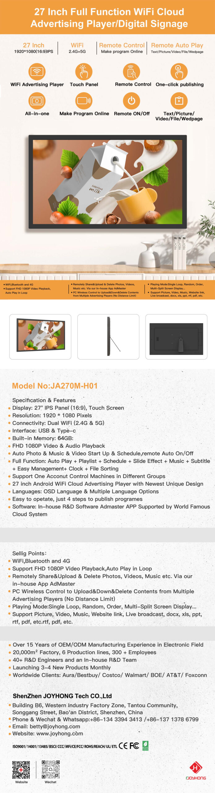 27 Inch All In One Advertising Player/Digital Signage ( Touch Screen / IPS 1920*1080 Pixels)(JA270M-H01)
