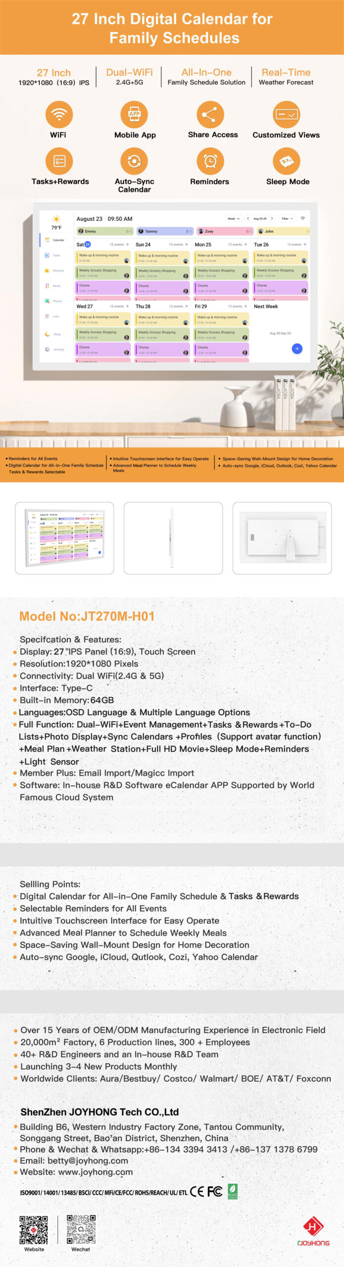 27 Inch Full Function WiFi Cloud Digital Calendar Frame(JT270M-H01)