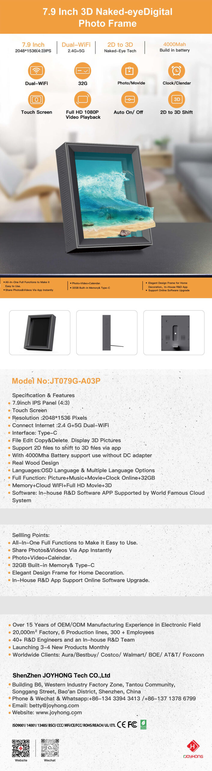 7.9 Inch 2D&3D Shift Wifi Digital Photo Frame (JT079G-A03P)